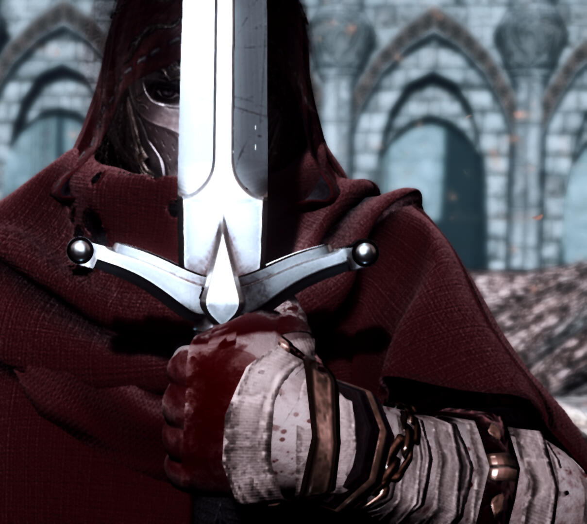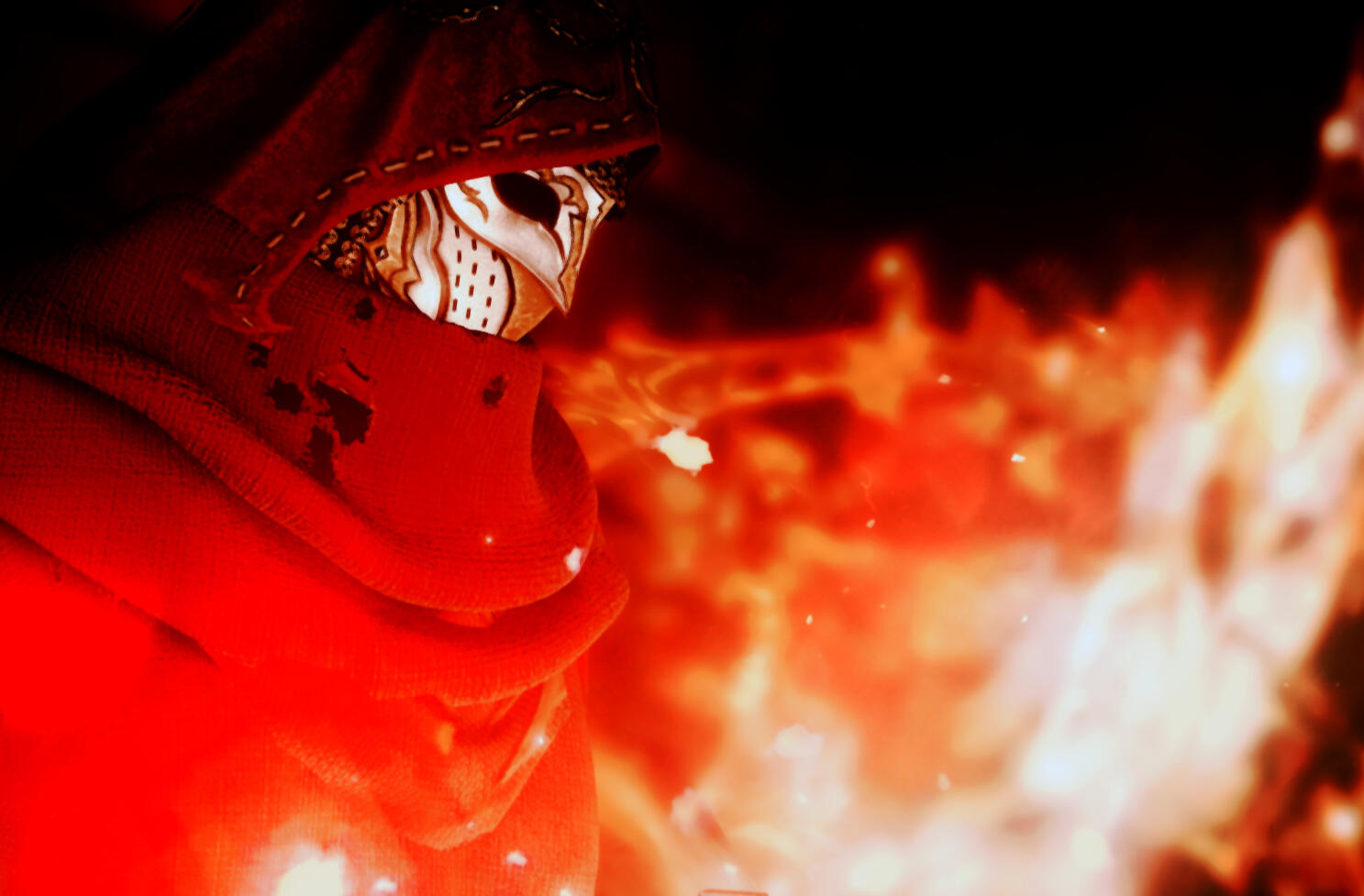 The man is stained red by uniform and duty. Mages practicing black or white magics illegally could know of the monster who hunts their ilk.